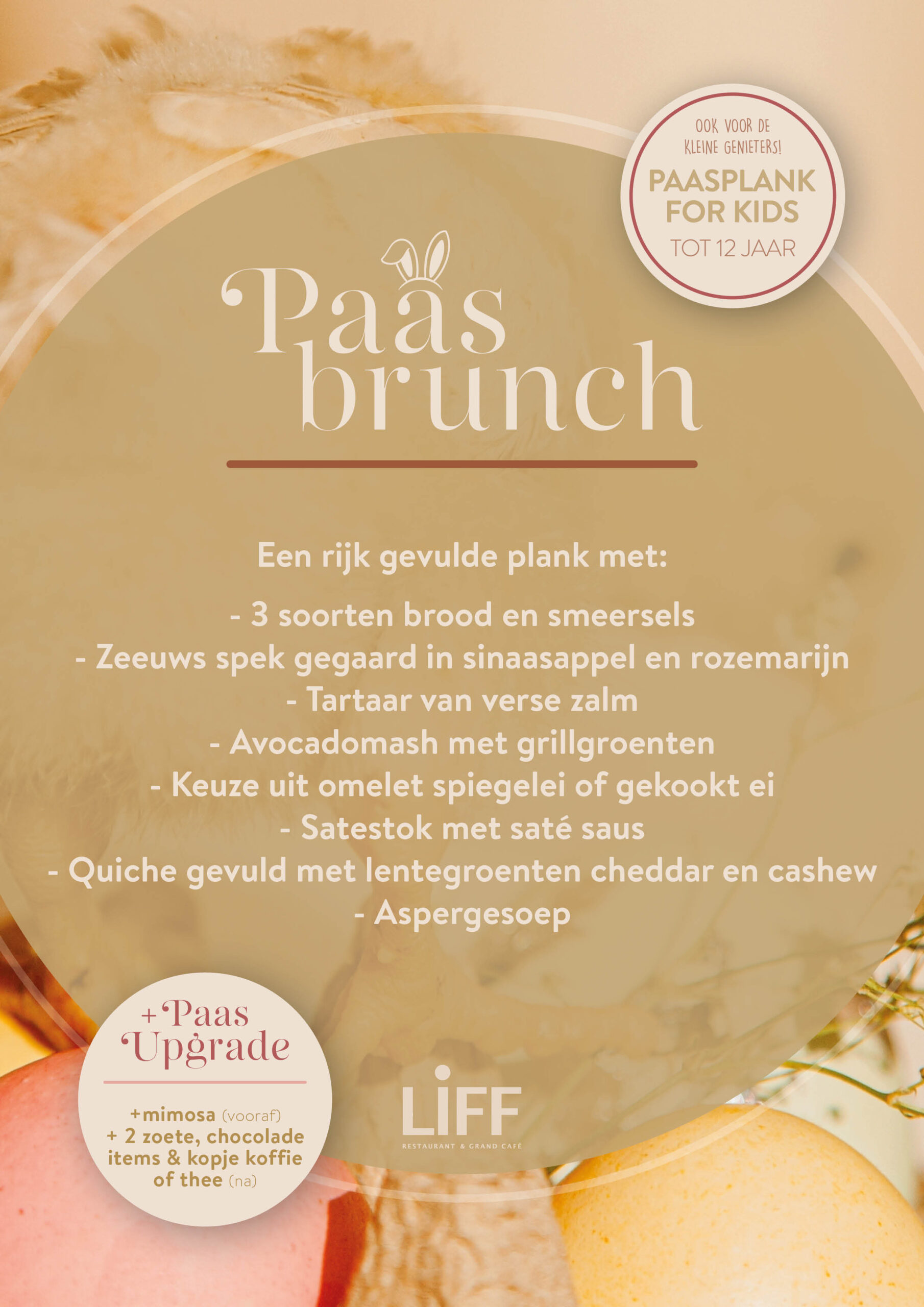 Vier Pasen in stijl bij LIFF! Reserveer jouw plek voor de Paasbrunch en geniet van een rijk gevulde dag vol heerlijke smaken. Ook voor de kleine genieters is er een speciaal aanbod: de Paasplank for Kids (t/m 12 jaar).